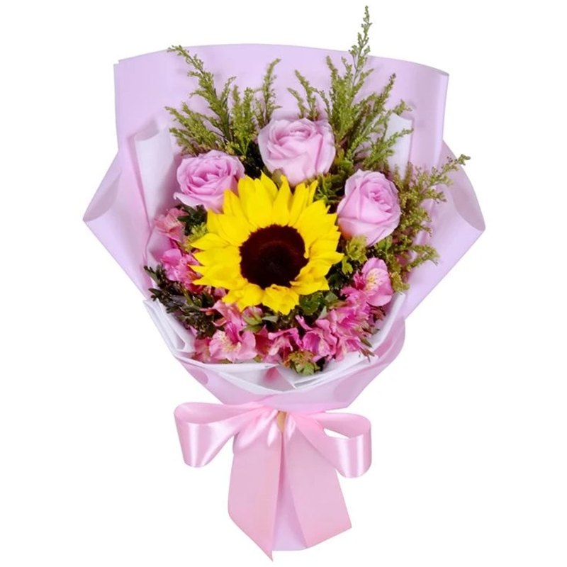 Букет состоит из 1 подсолнух, 3 розовые розы, 3 ветки альстромерии, декоративная зелень, красивая упаковка, атласная лента.