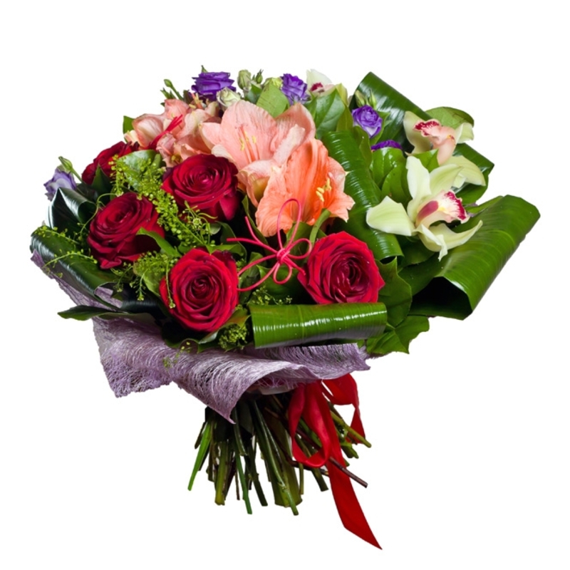 Букет состоит из 5 роз, 3 ветки эустомы, 1 амариллис, 1 орхидея, аспидистра, зелень, красивая упаковка, атласная лента.