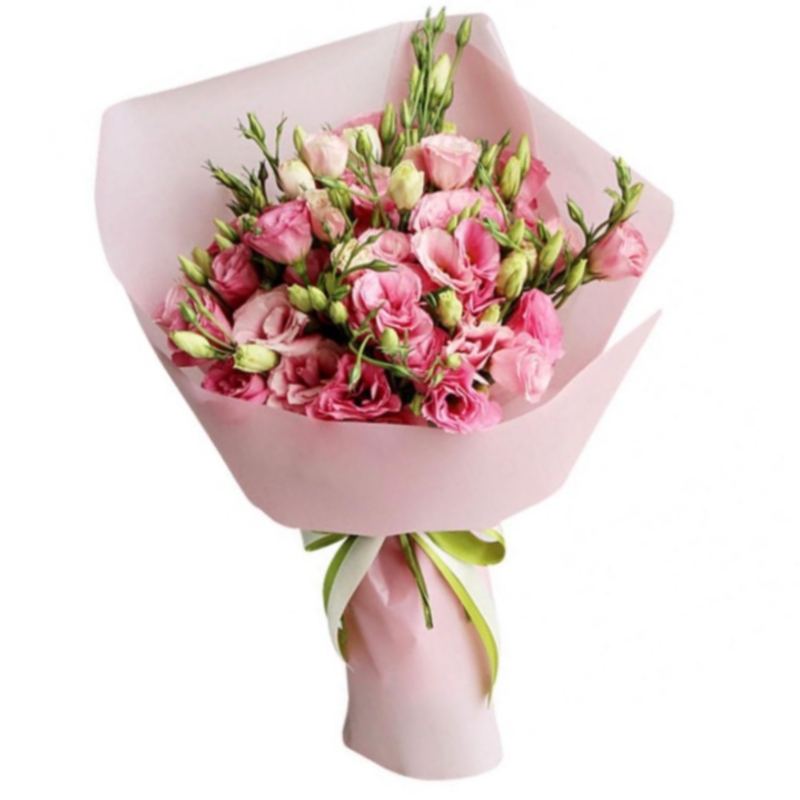 Букет состоит из 11 веток розовой эустомы, красивая упаковка, атласная лента.