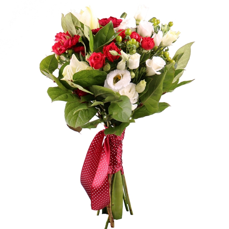 Букет состоит из 5 кустовых роз, 2 ветки эустомы, 1 амариллис, 3 гиперикум, зелень, прозрачная упаковка, атласная лента.