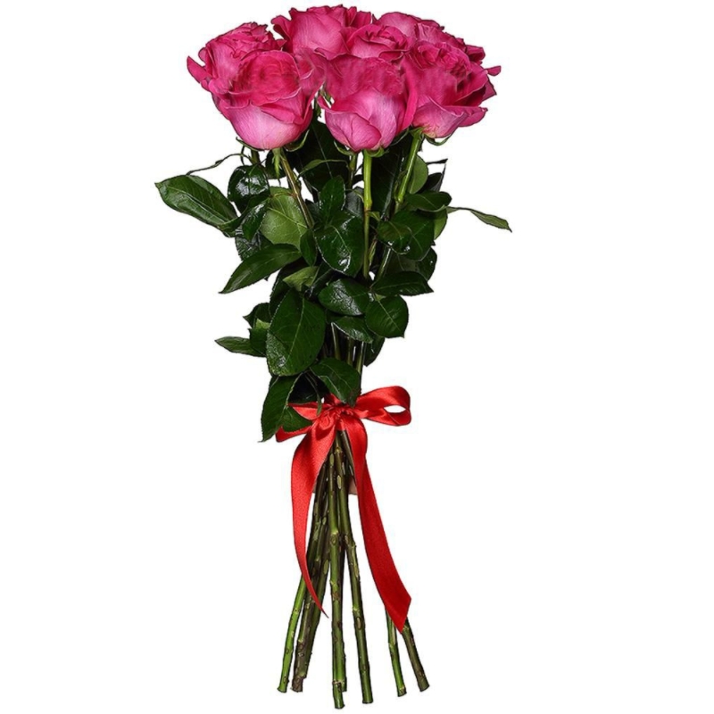 Букет состоит из 7 малиновых роз, прозрачная упаковка, атласная лента.
